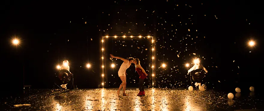 Le clair-obscur travaillé à toutes les étapes du spectacle participe à la confusion entre illusion et réalité entre rêve et cauchemar. Les lumières (Thomas Jolly/ Jean-François Lelong) mêlent les ambiances circassiennes, tapageuses, à celles intimistes des échanges où des ampoules suspendues à des fils éclairent les visages. Le feu des bougies qui découpe l’espace en ouverture instaure cette ambivalence où le danger guette.
