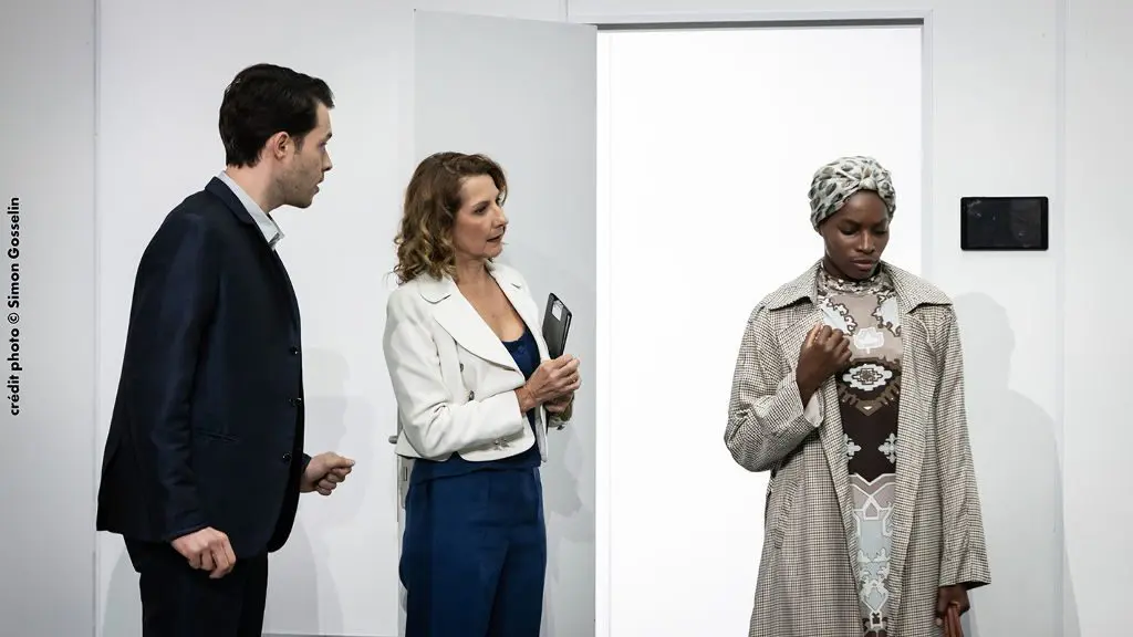 Lætitia Lalle Bi Benie interprète Trois. Tremblante, prostrée, la femme semble animée par une colère et une violence qui va s’exprimer au fil de la pièce. Tête basse, recroquevillée sous la douleur et le poids du choix qu’elle sait devoir assumer, la comédienne crache des bouts de mots. Comme si ces bribes de questions étaient un arrachement. Puis, le personnage prend l’ascendant sur les deux autres au point de les forcer également à quitter leur langage formaté.