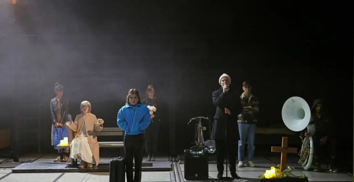 Loin de céder aux accents de désespoir qui irriguent les paroles des personnages, la mise en scène de Pascale Daniel-Lacombe inventive et alerte, cultive la poésie et la dérision. S’appuyant sur une scénographie fine et dynamique (Philippe Casaban, Eric Charbeau, Pascale Daniel-Lacombe), les espaces s’interpénètrent et toute logique vacille. Les éléments du décor, en mouvement sur des rails, apparaissent et disparaissent, comme par magie. Un banc, un réverbère, une table austère, un bahut, un fauteuil, un lit, une croix en bois, un vélo, une haute passerelle, construisent chacun une réalité, très vite absorbée par une autre. Les personnages traversent les espaces, poursuivent les dialogues, en faisant fi de toute temporalité. Ils sont en même temps, ici et ailleurs.