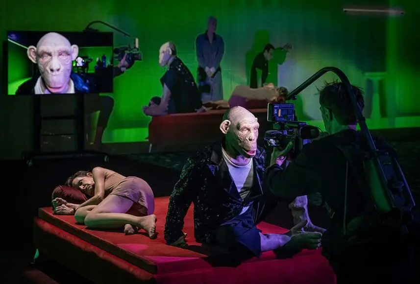 Par ailleurs, le travail visuel de Kamil Polak exploite avec virtuosité les jeux de cadrage. Plusieurs « réalités » s’entrechoquent et cohabitent dans le même temps. Le présent de la représentation est mis en question. La position des acteurs, les caméras qui projettent en direct le reflet du plateau sur deux ou trois écrans, le hors-champ, alimentent avec justesse la réflexion sur le « réalisme » . Le lien esthétique se fait également par la couleur. Les camaïeux de vert dominent, du plus profond au plus jaune, agrémenté souvent de strass.