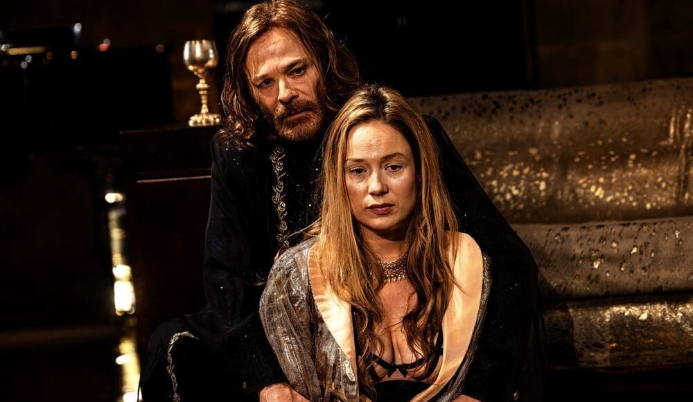 Le décor place la scène de retrouvailles dans la chambre où Paris et Hélène se sont aimés. L’or domine. Quatre longs miroirs rectangulaires ornent les murs de la pièce. Ils réfléchissent la lumière et les silhouettes floues des personnages. Hélène (Aurore Frémont) et Ménélas (Brontis Jodorowsky), sont-ils encore ce qu’ils ont été ? Parfois, ce sont les ombres déformées du public qui se devinent. Il s’agit de ne pas oublier que nous sommes au théâtre, un lieu de récit et de jeu. Le mur de fond de scène est d’ailleurs souligné par deux bandeaux lumineux, l’un d’un rouge flamboyant, l’autre d’un bleu roi éclatant. Comme si le lieu était en attente d’un rituel.