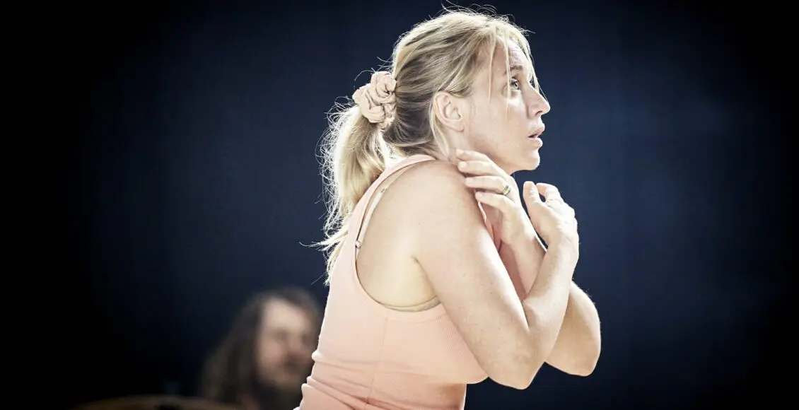 Ludivine Sagnier partage le plateau avec le musicien Pierre Belleville. Les percussions de la batterie nourrissent la création musicale de Dan Lévy et donnent écho à la violence ressentie par le corps de l’actrice. D’âpres spasmes la secouent, alors. Tête baissée, ses mains frappent son ventre. S’exprime par cette brutalité, ce que personne autour de V. ne veut voir : que son corps et son être ne lui appartiennent plus.