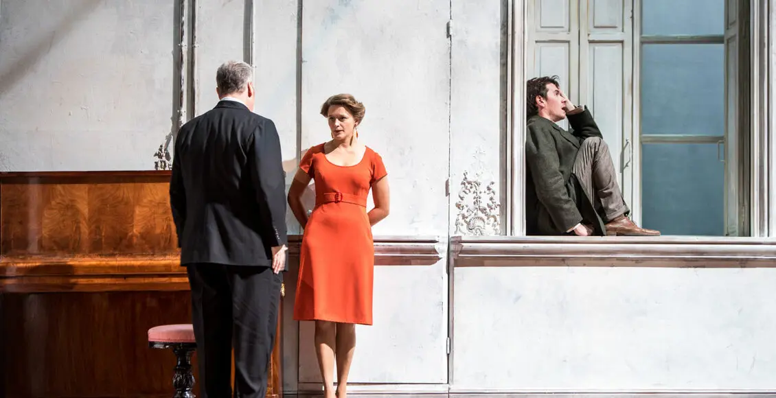 Dans la mise en scène de Clément Hervieu-Léger, ce rejet ne s’exerce pas dans le vide. Soutenu par la scénographie d’Eric Ruf, il prend place au cœur d’un monde clos, un salon, semblable à un écrin glacé. Le grand espace gris est rythmé par quatre escaliers. Chacun d’eux débouche sur un endroit qui échappe à la vue. Les moulures défraîchies rappellent un passé jadis splendide, désormais éteint. Les trois grandes fenêtres de fond de scène ne paraissent donner sur rien. Seuls quelques sons d’oiseaux ou l’aboiement lointain d’un chien témoignent parfois de la présence d’un jardin proche.