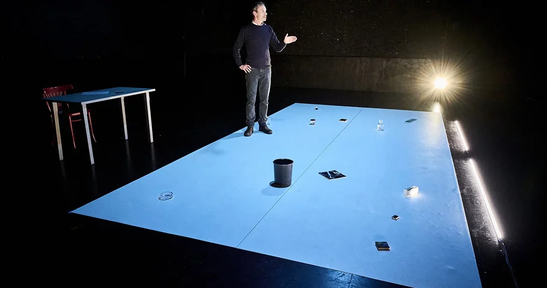 Cette incarnation restitue surtout la dimension profondément humaine de la pensée de Roland Barthes. Derrière l’intellectuel reconnu apparaît un homme en proie au doute, hanté par la disparition de sa mère et animé par le désir de recommencer sa vie à travers l’écriture. Le spectacle trouve là sa plus grande justesse. Il révèle qu’au-delà des concepts et des références savantes, l’œuvre de Barthes demeure traversée par une aspiration simple et vertigineuse, celle d’entrer enfin en littérature, comme si tout restait encore à écrire. La dernière image en témoigne. Dans le rectangle devenu bleu, Vincent Dissez ramasse les objets épars sur le sol et les replace. Tout est peut-être encore possible.