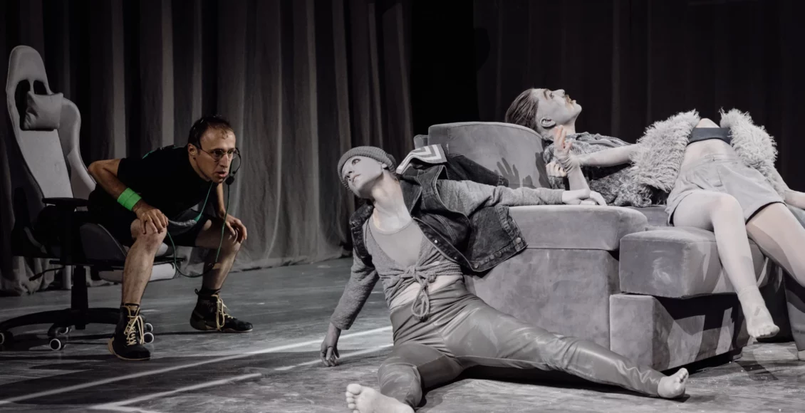 Des créatures hybrides, maculées de glaise, posées sur des chariots comme des poupées sans vie, sont amenées sur le plateau. Une femme (Marion Tassou) semblable à une gigantesque statue, domine la scène. Peinte de gris de la tête aux pieds, dotée d’un micro, la maîtresse du jeu, insuffle par sa respiration, l’étincelle qui anime les êtres en attente d’utilisation. Par son chant, qui ponctue chaque fin de partie, elle évoque la Diva Plavalaguna dans le film de Luc Besson, Le Cinquième élément.