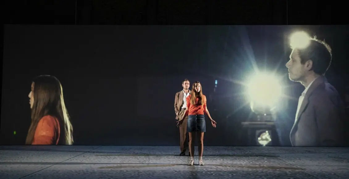 La représentation débute par les images d’une femme – Christine à soixante ans, interprétée par Cécile Brune – projetées sur un large écran rectangulaire suspendu en hauteur. Elle est assise dans un train. Son visage, en gros plan, légèrement de trois quart, s’affiche, tandis que par la vitre défile le paysage. Le titre du roman Le Voyage dans l’Est s’inscrit en lettres blanches en surimpression. Programmatique, cette entrée en matière, semble évoquer un voyage intérieur. L‘Est désigne une direction mais le verbe être conjugué, « est » , se dessine en creux. Voyager dans l’Est, c’est aussi parcourir ce qui « est » et a été.