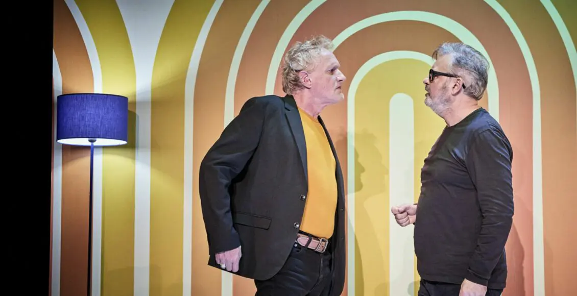 Dans la petite salle du Théâtre noir, le spectateur se trouve au plus prés des comédiens. Le décor minimaliste évoque les années 1970. Un panneau aux motifs géométriques orangés occupe le mur du fond. Le plateau est délimité par un tapis de sol clair. Un lampadaire d’appartement à l’abat-jour bleu s’allume parfois. Un banc massif blanc déplacé par les acteurs devient un des éléments majeurs qui rythment la scénographie, comme les lumières de Rodolphe Martin, qui poursuit ici encore, avec bonheur, son compagnonnage avec Sylvain Maurice.