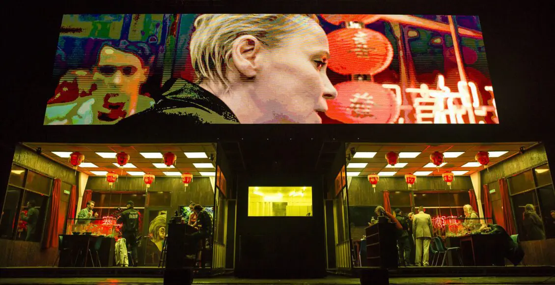 Bientôt, l’image prend corps. Le livreur se présente : « Je suis Artūrs. Je joue l’acteur qui se tient devant vous » .  Symbole de l’ubérisation de la société, c’est lui qui introduit les questions qui  irriguent tout le spectacle. A savoir, la valeur marchande de notre relation à l’art, celle de la copie face à l’original, celle du faux au regard du vrai. A partir de là, le décor, manié à vue, n’aura de cesse de changer, de se déplacer, de se transformer. Deux larges boites se meuvent sur le plateau en fonction des scènes. La guérite, qui s’avère être une cuisine sommaire tenue par un couple asiatique, suit le mouvement, tandis que, le plateau tourne à plusieurs reprises, en réorganisant son architecture.