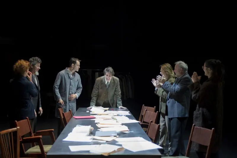 Sur scène, une longue table de travail rectangulaire s’impose comme l’élément fort du spectacle. Un canapé, déplacé à vue, vient compléter le décor. Au loin, des portants à vêtements attendent que les comédiens s’en saisissent pour incarner divers personnages. Les lumières (Nicolas Faucheux, Chloé Roger) et le travail musical et sonore (Stéphanie Gibert), animent les différents tableaux. Kazan, Stalingrad, Moscou, les camps de concentration nazis, ou soviétiques, prennent vie avec évidence. Notamment, grâce à la vivacité de la mise en scène, et l’énergie des corps et des voix. L’adresse public est revendiquée et invite, sans didactisme, le spectateur à devenir témoin du récit et de l’Histoire sanglante du XXe siècle en marche.
