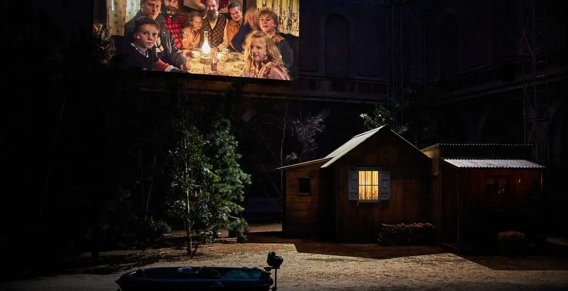 Sur le plateau, la nature est omniprésente. Une forêt primaire, d’arbres hauts aux teintes sombres, entoure la cabane en bois où vit la famille. Les personnages parfois paraissent se perdre et disparaissent à la vue des spectateurs. Devant coule une rivière. Les enfants, mis à la hâte, sur une barque, y seront poussés pour échapper à la violence des « autres » . Cette belle scénographie (Ruimtevaarders), évocatrice d’un royaume perdu et circonscrit, n’est pas sans rappeler celle de Mathieu Lorry-Dupuy pour Cataract Valley, mise en scène par Marie Rémond et Thomas Quillardet, qu’on avait pu voir à Berthier, en 2020. A l’extrémité de la scène, à cour, une barrière en bois se dresse. Certains la franchiront mais rien ne sera donné à voir du royaume ennemi, laissant le spectateur imaginer ce qu’il veut.