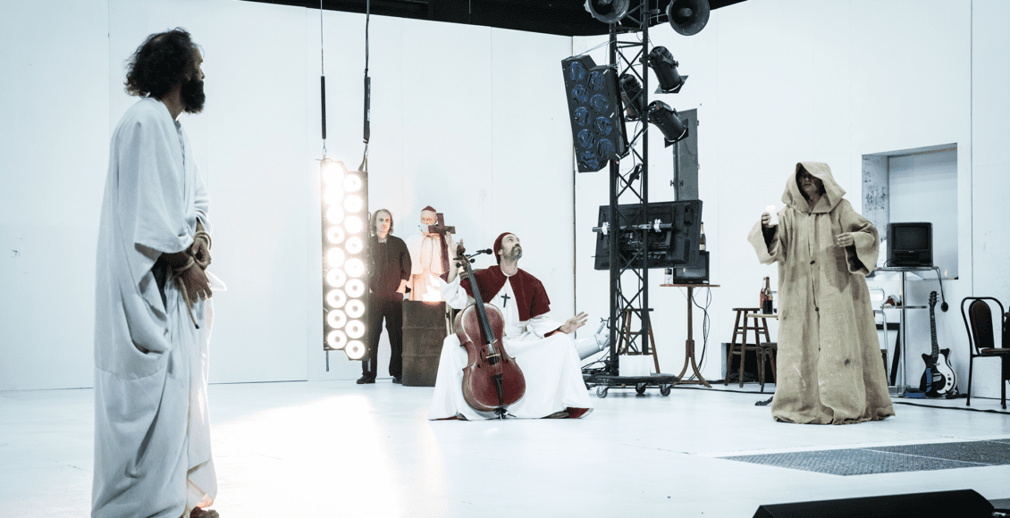 Si le début du spectacle met en scène l’opposition entre celui qui revient ( le débonnaire Arthur Igual) et le grand inquisiteur ( l’imposant Sava Lolov), Sylvain Creuzevault, très vite, s’en écarte pour interroger le chaos comme forme de révolte contre les anciens et nouveaux césars. Ceux qui ont accepté Rome et le glaive de César, ceux qui se sont « déclarés les seuls rois de la terre », ceux qui ont convaincus les hommes d’abdiquer leur liberté en leur faveur.