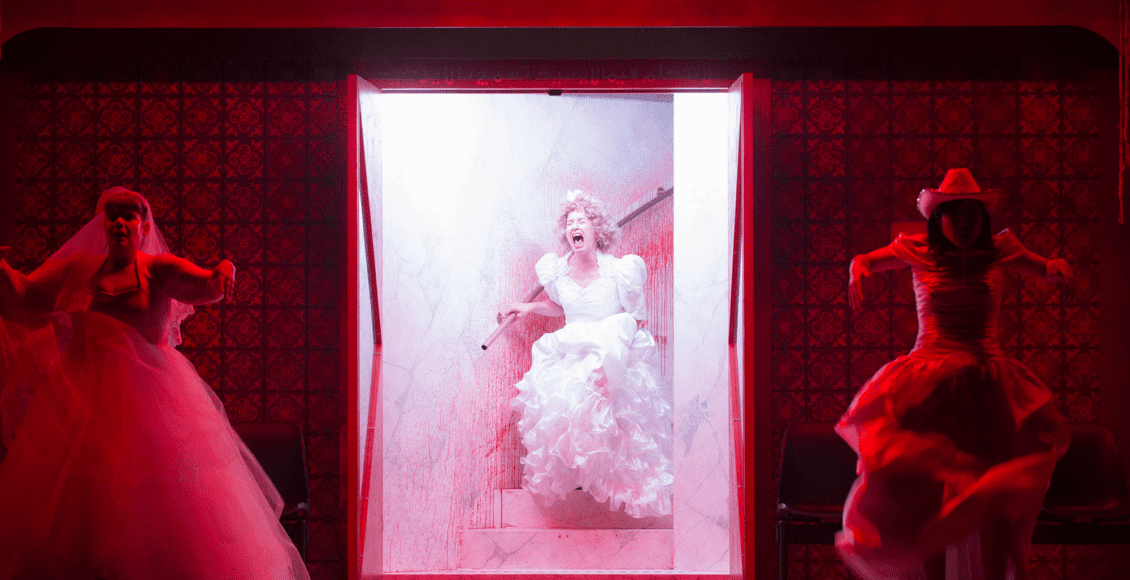 L’ouverture est saisissante. Tandis que les spectateurs s’installent, sur le plateau, des jeunes filles en robe de mariée, assises, attendent dans une salle carrelée. Une musique lénifiante se diffuse et tranche avec la crainte que l’on perçoit. Soudain, une alarme sinistre retentit. Une lumière verte s’allume et les deux battants de la porte centrale s’ouvrent en fond de scène sur un escalier de marbre blanc. Une des épousées se lève et commence à gravir les marches. Elle lance un dernier regard vers nous, puis les portes se referment brutalement. Le cérémonial se répète, rythmé par le grésillement macabre des néons. Au fil des minutes, l’escalier blanc est maculé du sang de toutes celles qui l’ont emprunté.