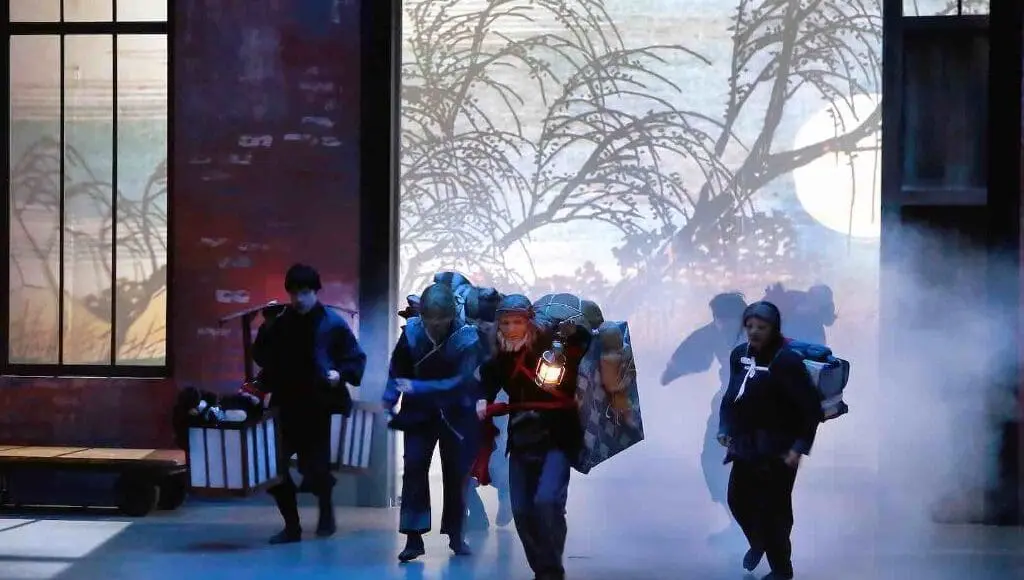 L’entrée dans le hall du théâtre donne le ton. De grands kanjis japonais s’affichent sur des fonds rouges suspendus au plafond à côté d’une multitude de lampions blancs. De Japon, il sera question. Mais aussi de théâtre, de foi en l’humanité et d’humour.