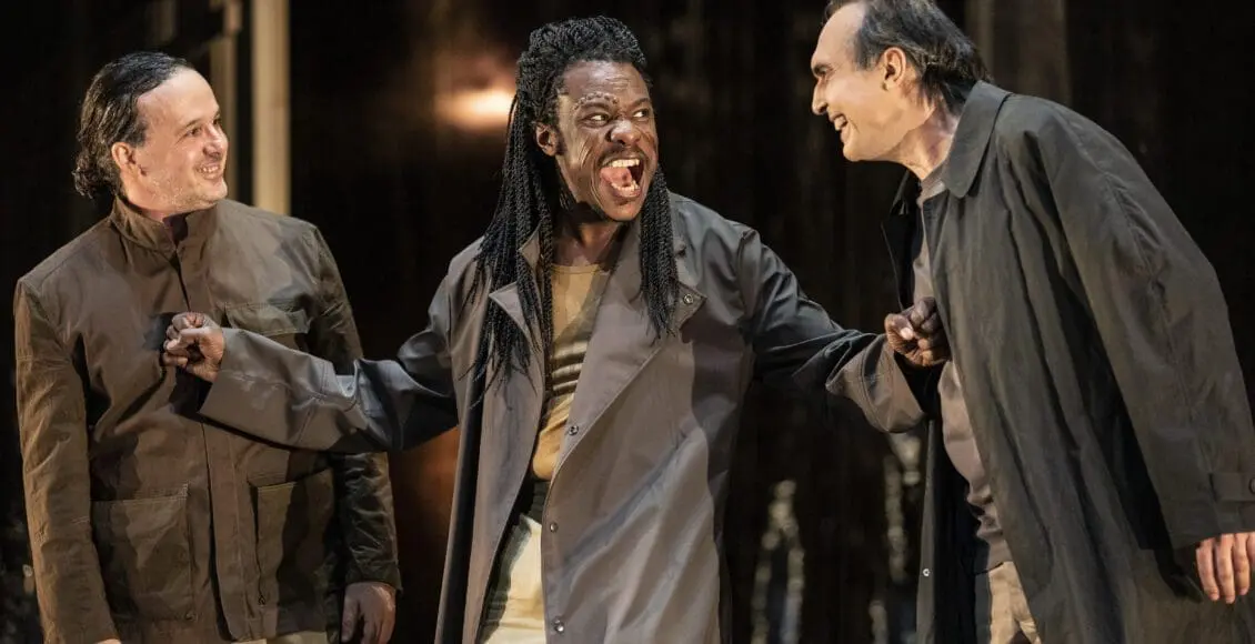 Le rire est un choix manifeste de la mise en scène de Jean-François Sivadier. Mais, celle-ci questionne également la complexité des liens entre Iago ( Nicolas Bouchaud) et Othello (remarquable Adama Diop). Loin d’être juste l’affrontement entre un traître et un homme de bien, elle révèle la sourde emprise de l’un sur l’autre. Il semble que si Iago parvienne à se faire si aisément entendre, c’est qu’il parle aussi la langue de ceux qui manquent de considération. Car, Othello, le Maure, le héros, que Venise envoie combattre les Turcs, reste aux yeux de la République des Doges, un barbare que sa peau noire trahit.