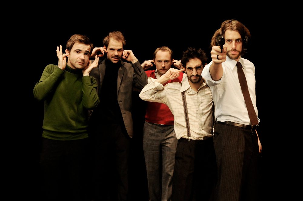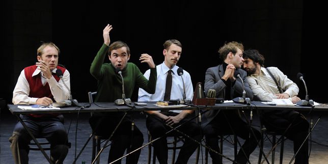 Ils sont cinq ( Romain David, Jérôme De Falloise, David Murgia, Benoît Piret, Jean-Baptiste Szézot), issus du Conservatoire de Liège. Sur scène, cintrés dans leurs habits des années soixante, alignés devant une table et des micros, ils campent les chroniqueurs d’une émission culturelle radiophonique « Épigraphe » qui vit sa dernière. Les crédits sont coupés mais, dans une sorte de baroud d’honneur, les journalistes avec un phlegme désopilant vont tenter de la mener jusqu’à son terme alors que tout se désagrège, matériel, groupe, vernis culturel de l’amitié.