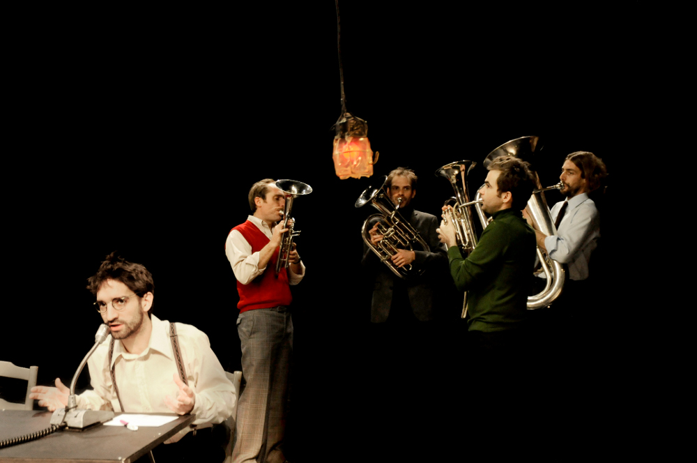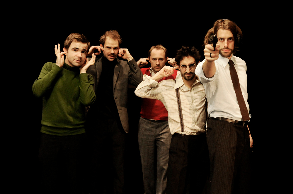 Ils sont cinq ( Romain David, Jérôme De Falloise, David Murgia, Benoît Piret, Jean-Baptiste Szézot), issus du Conservatoire de Liège. Sur scène, cintrés dans leurs habits des années soixante, alignés devant une table et des micros, ils campent les chroniqueurs d’une émission culturelle radiophonique « Épigraphe » qui vit sa dernière. Les crédits sont coupés mais, dans une sorte de baroud d’honneur, les journalistes avec un phlegme désopilant vont tenter de la mener jusqu’à son terme alors que tout se désagrège, matériel, groupe, vernis culturel de l’amitié.