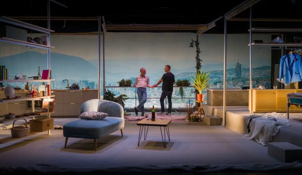Visuellement, l’étrangeté règne. Gurshad Shaheman et Dany Boudreault évoluent derrière un voilage transparent. Le décor s’apparente à un vaste appartement. Trois pièces principales prennent place en avant-scène. Un salon au centre, flanqué d’un bureau, à jardin, et une chambre légèrement surélevée, à cour. A l’arrière se devine une cuisine. Une toile de fond fait exister un balcon qui surplombe une ville moderne : Sarajevo. Le lieu où les artistes ont finalisé le projet Sur tes traces.