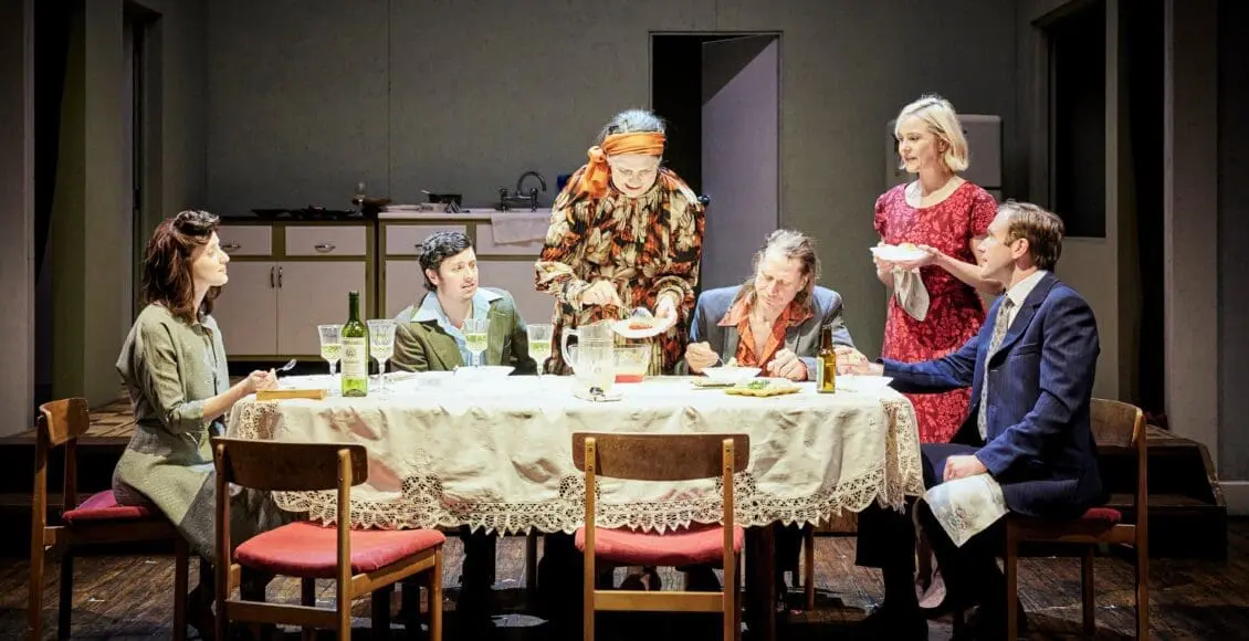 The work on the costumes (Marg Horwell) is remarkable. The meticulous attention to detail gives the colours a strong symbolic value. When Alice is still the bearer of life in her relationship, she wears a burgundy dress (similar to the one on the proscenium curtain). But after a few years, like Watteau‘s « Gilles », she is dressed in ceruse white. To the point of disappearing into the domestic world that is her daily life, the sideboard, the table, the walls, the fridge. Like the melancholy actor still wearing his theatrical costume, Alice has lost herself on the social stage. Vampirized by her interior, she is just another piece of furniture.